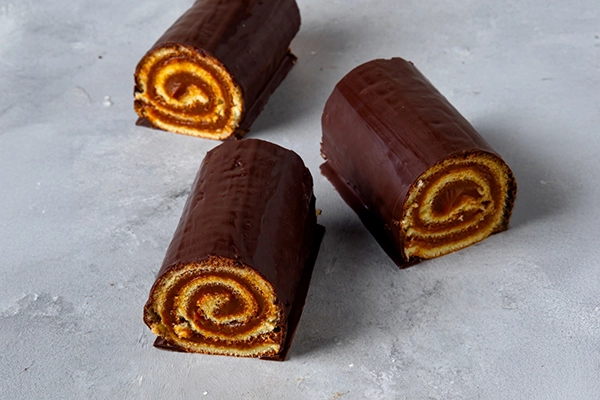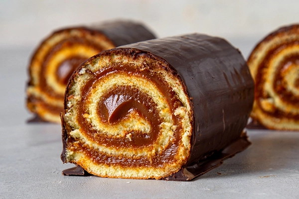 Esponjoso pionono arrollado con dulce de leche cubierto con chocolate. Para un momento dulce.