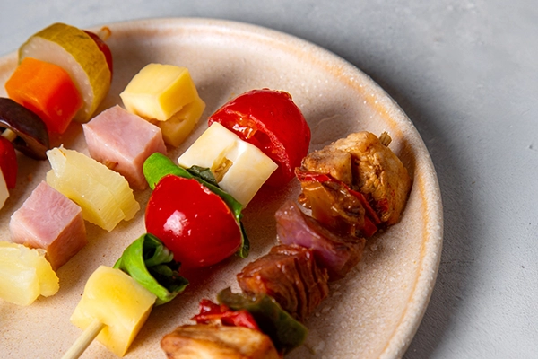 Pinchos de carne, pollo, quesos, jamón cocido y verduras intercaladas. Se venden por unidad listos para calentar y servir.