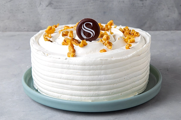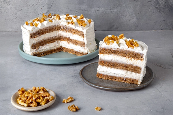 Capas de bizcochuelo húmedo de zanahoria y nueces, con crema buttercream. Decorada con la misma crema, sembrada de nueces tostadas. Rinde 8 porciones ,húmeda y diferente.
