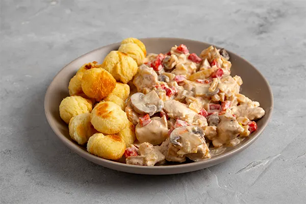 Salteado de lomo o pollo con verdura y una salsa a base de crema, acompañado de papas noisette. Ideal para eventos o reuniones familiares. Listo para calentar.