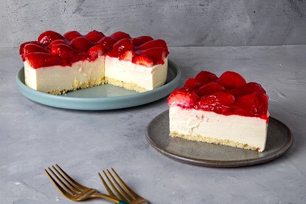 Finas capas de bizcochuelo de vainilla, batido de queso blanco descremado endulzado con edulcorante . Decorado en toda su superficie con trozos de frutillas naturales, pintada con jalea de frutilla- pesa 1200 kg rinde 10 porciones. Ideal como postre saludable.