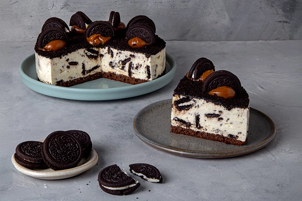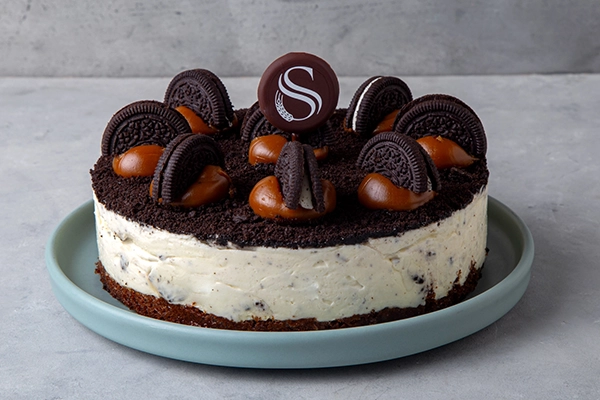 Base bizcochuelo de chocolate, batido de queso y crema con tropezones de oreo. Decorada con oreos y dulce de leche. Pes a1 k aprox. y rinde de 8 a 10 porciones. Actual y deliciosa.