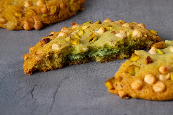 Cookie artesanal, amasada con trozos de pistacho y chips de chocolate blanco. Crocantes por fuera y suaves por dentro, con un relleno cremoso de sabor pistacho. Se venden por unidad. Ideales para acompañar infusiones o como un tentempié dulce y sofisticado