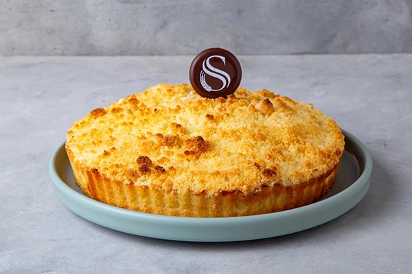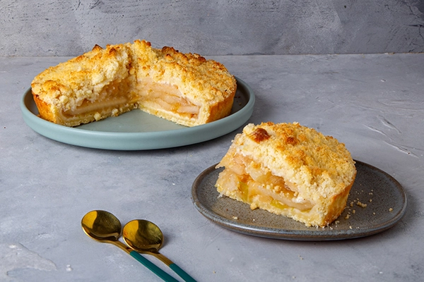 Base de masa quebrada, pure de manzana con capas de manzana fileteadas. Cubierto con un crumble a base de harina y manteca cocida. Pesa 950 grs. rinde 8 porciones aprox, ideal para la hora del te o un postre liviano.