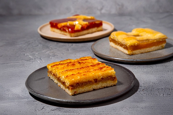 Cuadrado de masa quebrada, rellena de dulce de leche cubierto de crocante de coco cocido. Para un momento dulce.