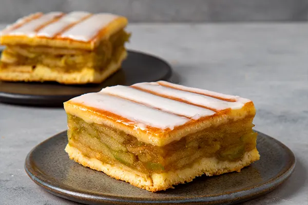 Tradicional cuadrado de manzana, masa quebrada, rodajas de manzana en compota, decorada con glaseado.