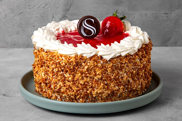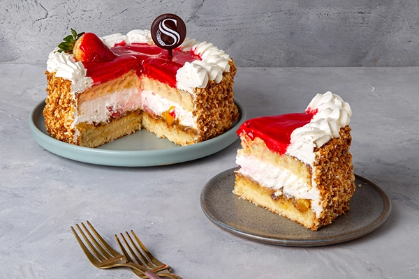 Bizcochuelo de vainilla, crema chantilly, dulce de leche, con un sembrado de duraznos en almíbar, frutillas y castañas al marrasquino. Terminada con un espejo de salsa de frutilla con borde de chantilly y frutilla en el centro- pesa 1,300 kg aprox. rinde 8 porciones- Ideal para cualquier ocasión.