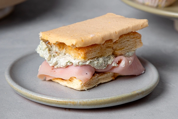 Bocado de fino hojaldre de manteca bañado en merengue horneado, rellenos roquefort, queso, jamón o a elección. Se venden por unidad se pueden consumir fríos o calientes.