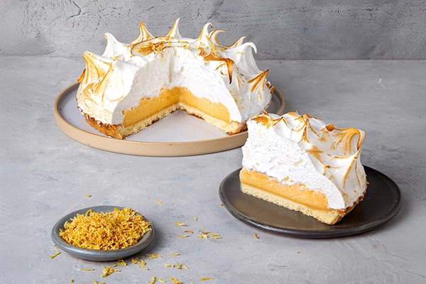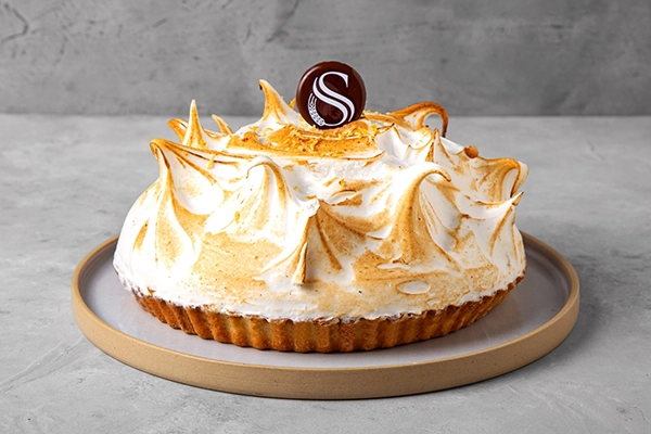 Masa quebrada, crema de limón terminada con merengue italiano flambeado. Peso aprox. 1,100 kg rinde 10 porciones. Ideal para la hora del te.