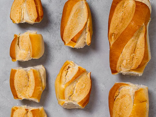 Pieza de pan francés de 30 grs aprox. sin sal agregada. Entran 30 un por kilo aprox.