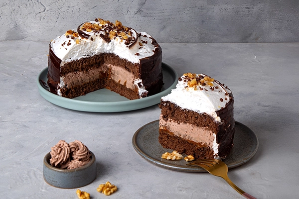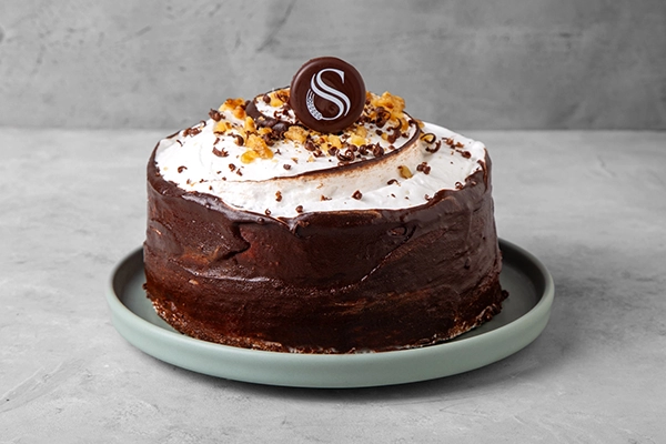 Bizcochuelo de chocolate, relleno de mousse de chocolate y dulce de leche, espatulado con merengue italiano, hilos de chocolate y nueces picadas. Peso aprox. 1,2 kg, rinde 10 porc. Ideal para el postre.
