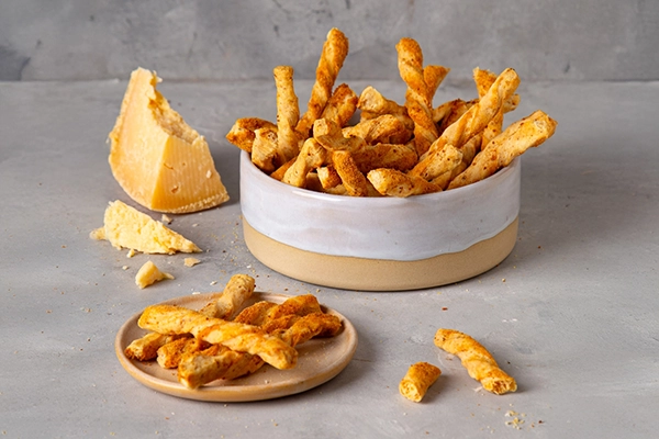 Palitos trozados de hojaldre y queso sardo. Se vende en paquetes de 100 grs.