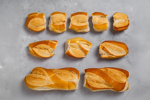 Pieza de pan francés de aprox. 10 cm entran entre 8 y 10 por kilo.