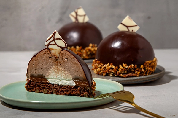 Semiesfera con base de bizcochuelo de chocolate amargo, corazones de crema chantilly bañado con mousse de chocolate. Terminado con baño de chocolate belga, con copos de mousse y trozos de frutilla.