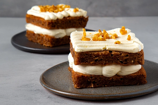 Capas de bizcochuelo húmedo de zanahoria y nueces, con crema buttercream. Decorada con la misma crema, sembrada de nueces tostadas.