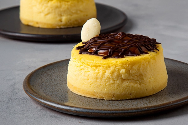 Base de torta de queso con topping de dulce de leche y chocolate semiamargo.