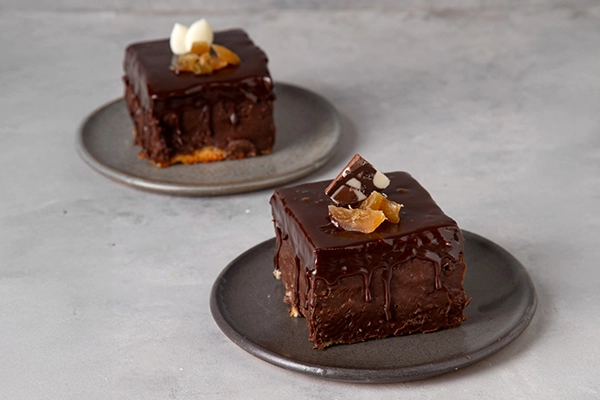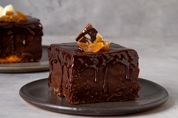 Bizcochuelo de vainilla, dulce de leche, ganache cítrica de chocolate y naranja. Terminada con ganache de chocolate, tableta de chocolate y naranjas glaseadas.