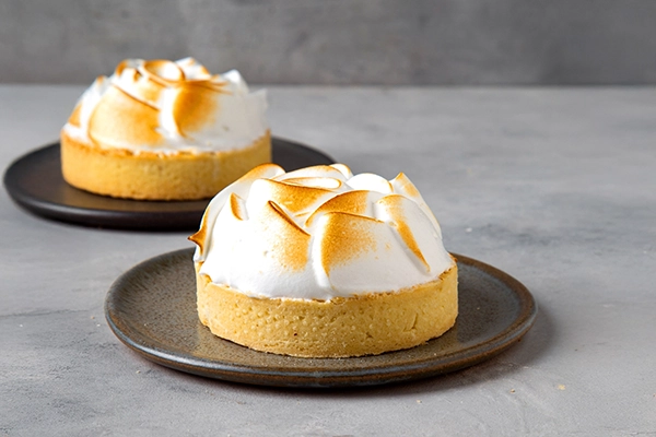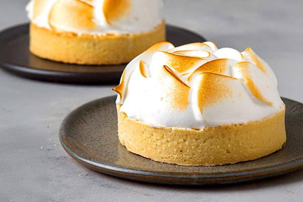 Tradicional lemon pie, masa quebrada, crema de limón y merengue italiano flambeado.