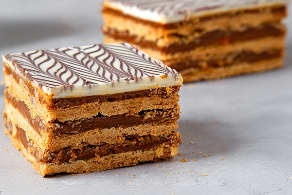 Laminas de hojaldre intercaladas con delicioso dulce de leche y cubiertas de chocolate. En cuadrados de 8 x 8cm . Para un momento dulce.