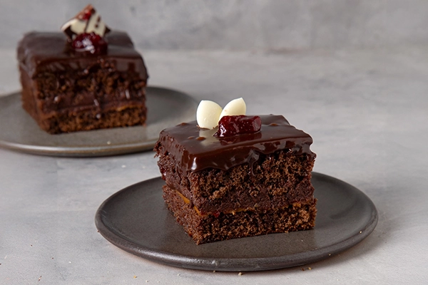Bizcochuelo de chocolate intenso, dulce de leche, ganache de chocolate y frutos rojos. Decorada con ganache de chocolate y frutos rojos.