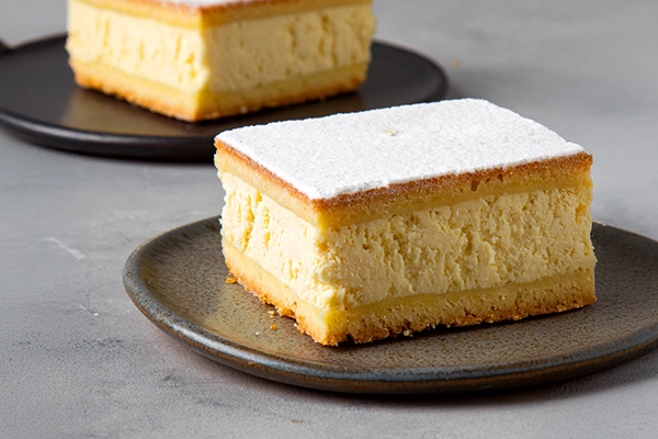 Tradicional cuadrado de ricota, masa quebrada y relleno de ricota con una pizca de ralladura de limón.
