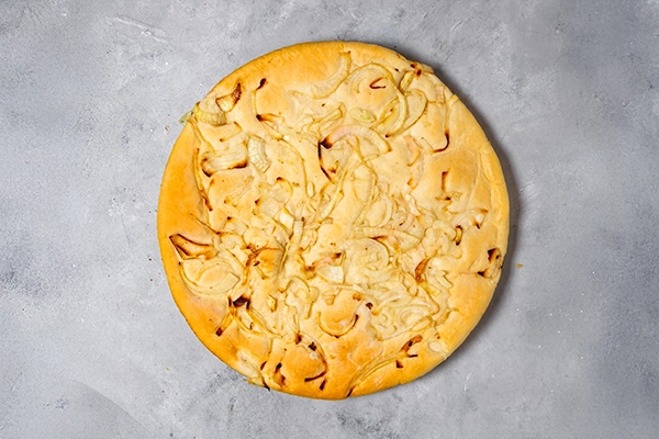 Deliciosa pizza tipo casera, con cebollas en juliana. Rinde 8 porciones.