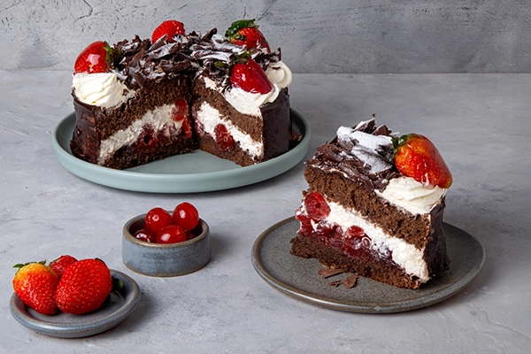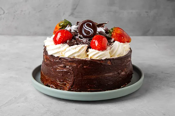 Bizcochuelo de chocolate con crema batida, jalea de frambuesa y cerezas al marraschino. Decorada con espatulado de crema, y chocolate con copos de crema batida, frutillas frescas y rulos de chocolate pesa aprox. 1,300 k, rinde 10 porciones. Un regalo clásico.