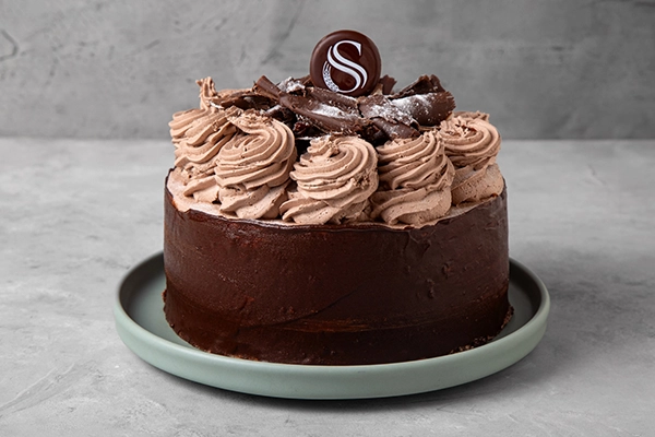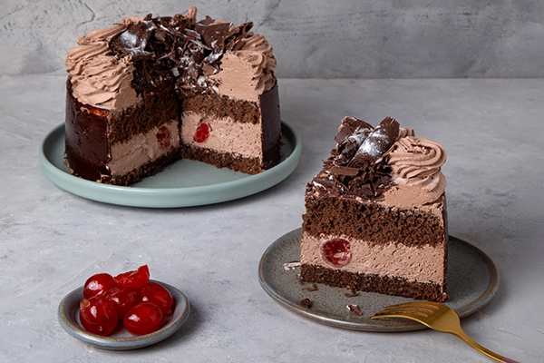 Bizcochuelo de chocolate, relleno de mousse de chocolate y cerezas al marraschino. Decorada con copos de mousse y rulos de chocolate belga. Un clásico para la hora del te. Rinde 10 porciones aprox.
