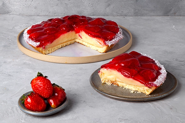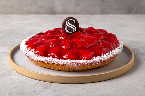 Base de masa quebrada, crema pastelera terminada con frutillas frescas en mitades bañadas en jalea de frutillas. Peso aprox. 1,350 kg rinde entre 10 y 12 porciones. Un clásico del te o como postre.