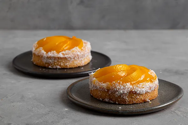 Base de masa quebrada, rellena con crema pastelera y decorada con mitades de duraznos y baño de gelatina brillante. Ideal como postre o para acompañar la hora del té.