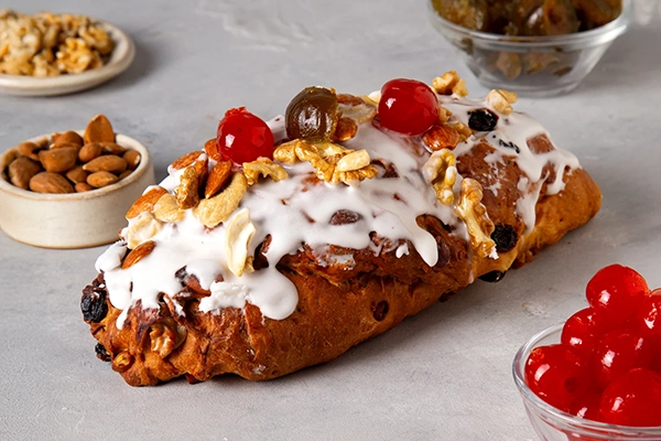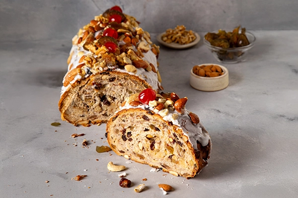 Clásico pan dulce de origen europeo, elaborado con receta belga tradicional. Masa suave y perfumada, enriquecida con blend de licores, cítricos y frutos secos seleccionados. Relleno con pasta de almendras que le aporta una textura húmeda y esponjosa. Se ofrece en unidades de medio kilo o en porciones al peso, ideal para disfrutar en cualquier momento o compartir. Sin conservantes ni colorantes. Disponible todo el año en nuestras sucursales.