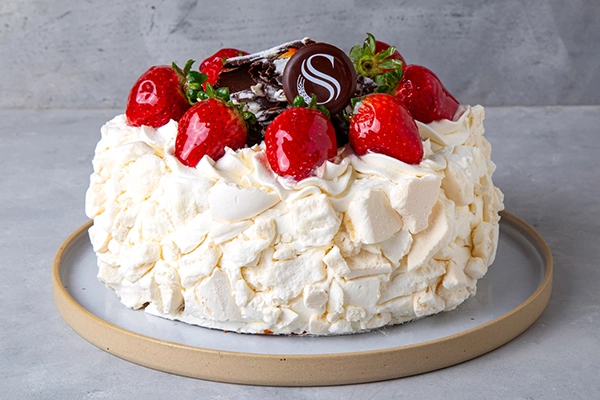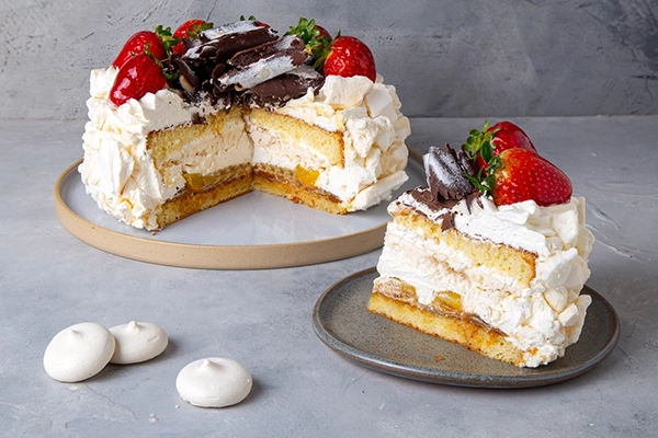 Bizcochuelo de vainilla, dulce de leche, trozos de merengue secos, y duraznos en almíbar. Terminada con crema chantilly , merengue secos en trozos, frutillas frescas y virutas de chocolate. Pesa 1,350 kg. aprox. rinde 8 porciones. Ideal como postre.
