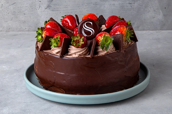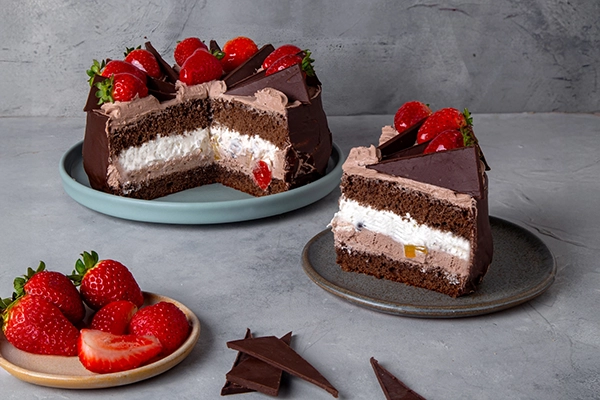 Bizcochuelo de chocolate, mousse de chocolate intenso cerezas al marraschino, trozos de durazno y crema batida. Tiene cobertura de chocolate en los laterales capas de mousse con trozos de frutilla, triángulos de chocolate en forma de mollino. Pesa 1200kg. aprox. rinde 8 a 10 porciones. Una elección segura.